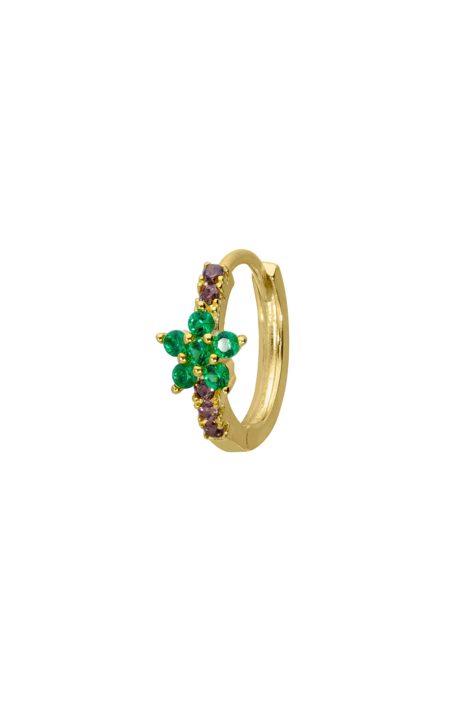 Petites boucles d’oreilles en vermeil, soit argent 925 avec un placage à l’or fin 18 carats. Mini créoles pavées de strass rose clair effet tourmaline, avec en son centre une petite fleur pavées de crystaux vert effet émeraude. Elles peuvent s’acheter en paire ou à l’unité.