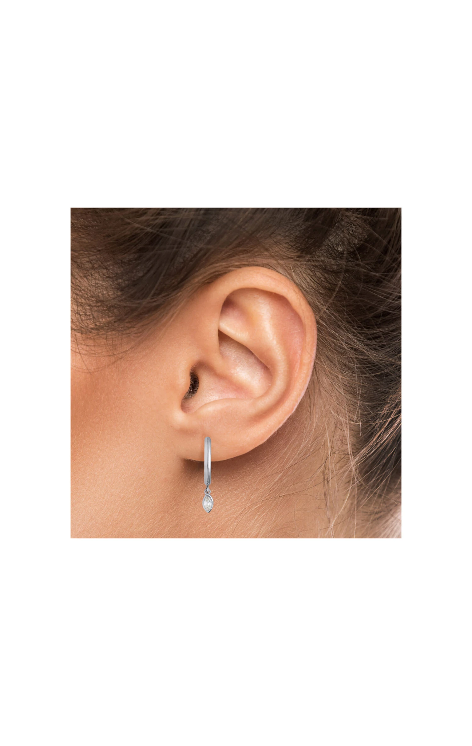 Mini créoles dites “hoops” en argent 925, ornées d’une pampille marquise en cristal effet diamant. Elles peuvent s’acheter en paire ou à l’unité.