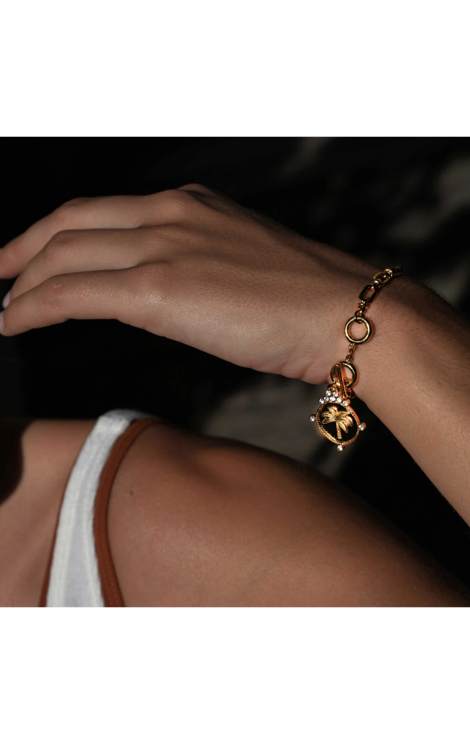 Osez la grosse maille avec notre bracelet Delsol! Comme une invitation au soleil, à la douce folie et l’énergie des années 1990, on adopte ce bracelet chaîne imposant façon gourmette. Son fermoir anneau est orné d’une médaille ouvragée avec un palmier au centre, surplombé d’une petite couronne strassée. Cette médaille est entourée de strass effet diamant pour lui apporter de la lumière. On adore ce côté classique, cette chaîne au joli volume, avec une vibe très summer style tout en panache. Ce bijou est fait à la main.