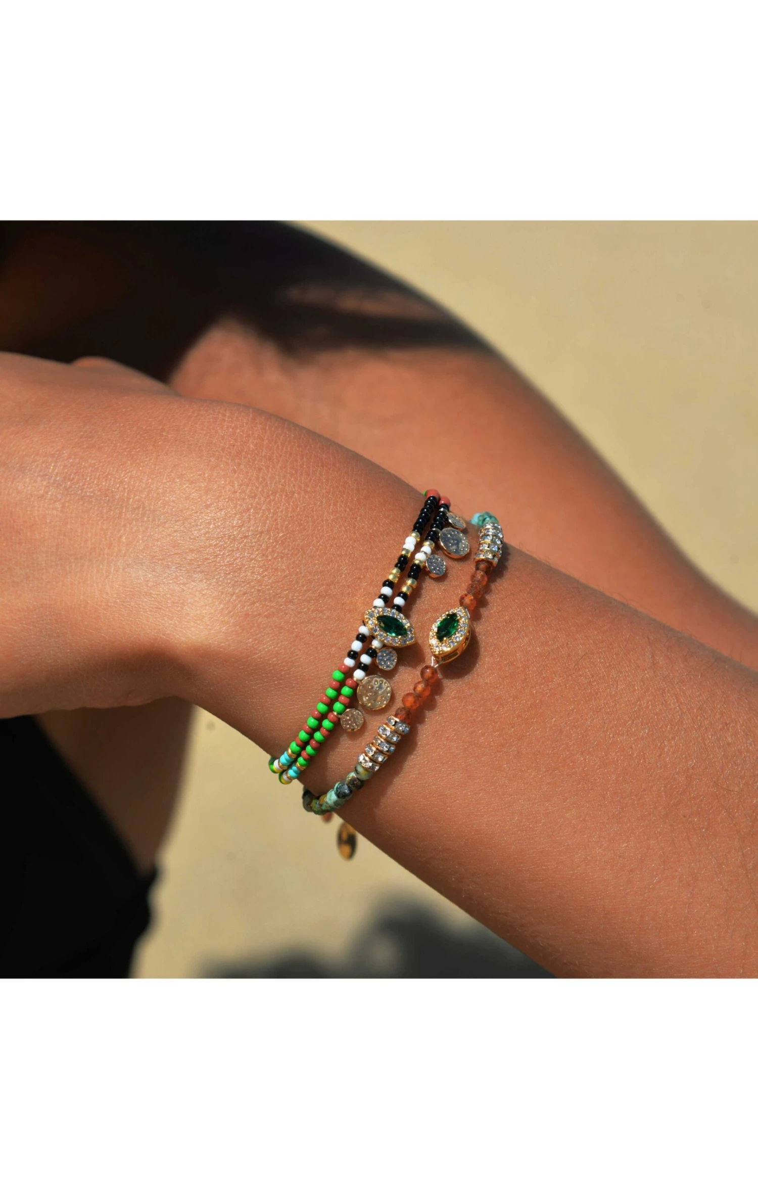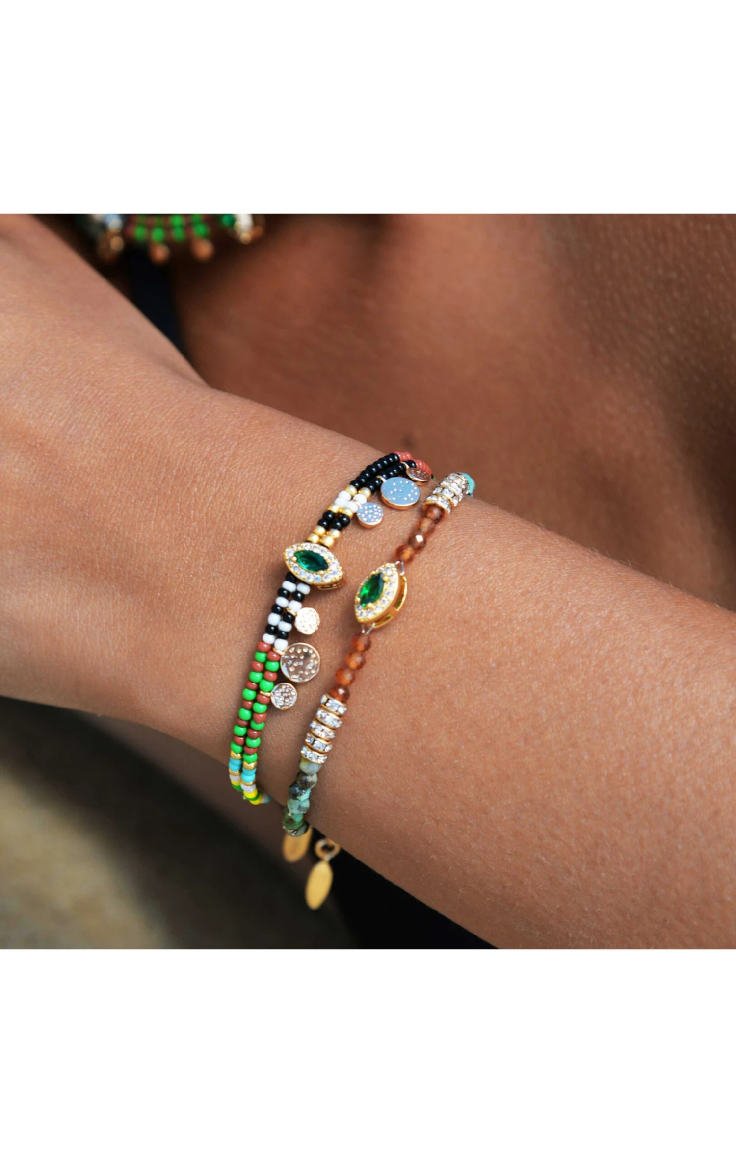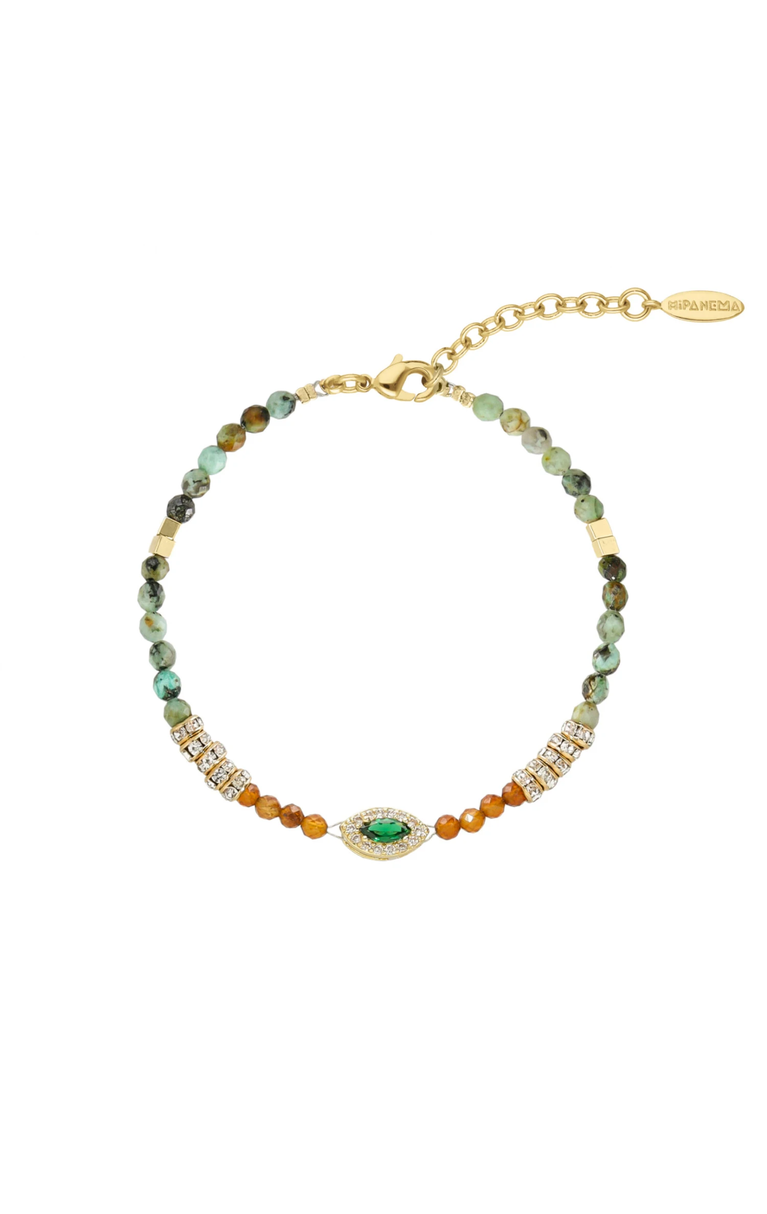 Ravissant bracelet doré, monté sur un rythme symétrique de perles de verre et pierres semi-précieuses colorées, dans des tonalités turquoise et bambou de mer rouge orangé. Au centre, un cabochon oval travaillé orné d’une pierre verte effet émeraude. On aime le rendu ethnique chic raffiné et joyeux pour ce bijou fait à la main.