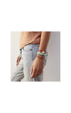 Des couleurs, de la joie, un tissage hypnotique, pas de doute, c’est un bracelet Hipanema! La griffe revisite ses pièces iconiques avec ce bracelet tissé dans des tonalités pop, vert fluo, café, crème, noir, aux perles colorées cousues de chaque côté. Pour la touche sophistiquée, un cabochon précieux s’invite au milieu avec une pierre vert olive effet smoky. Six petites pampilles dorées de tailles différentes achèvent de faire de ce bracelet fait à la main, le hit de votre été.