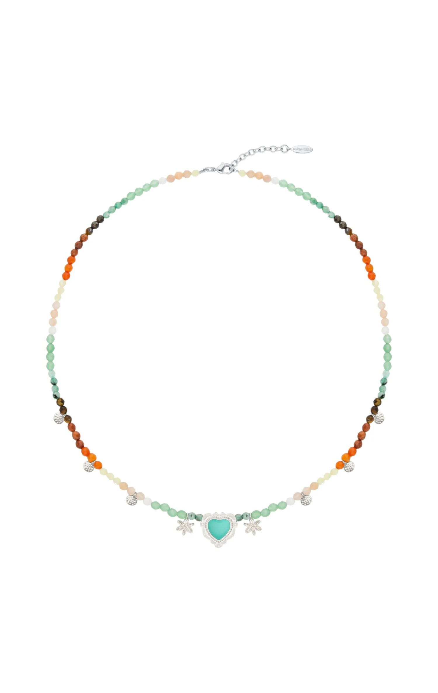 Collier en pierres semi-prĂ©cieuses – tourmaline rose, quartz teintĂ©, hĂ©matite, turquoise – sur un montage en laiton argentĂ©, rehaussĂ© de petites pampilles argentĂ©es. On aime le mĂ©lange AmĂ©rique Latine des pierres colorĂ©es, dans une dĂ©clinaison de tonalitĂ©s Terre, ocre, avec ce cabochon central en forme de cĹ“ur ex-voto travaillĂ© d’inspiration Nouveau-Mexique, ornĂ© d’une rĂ©sine turquoise. Il est entourĂ© de deux petites pâquerettes strassĂ©es effet diamant. Une ravissante pièce facile, pile dans l’ADN Hipanema, Ă porter seule ou en accumulation. Ce bijou est fait Ă la main.