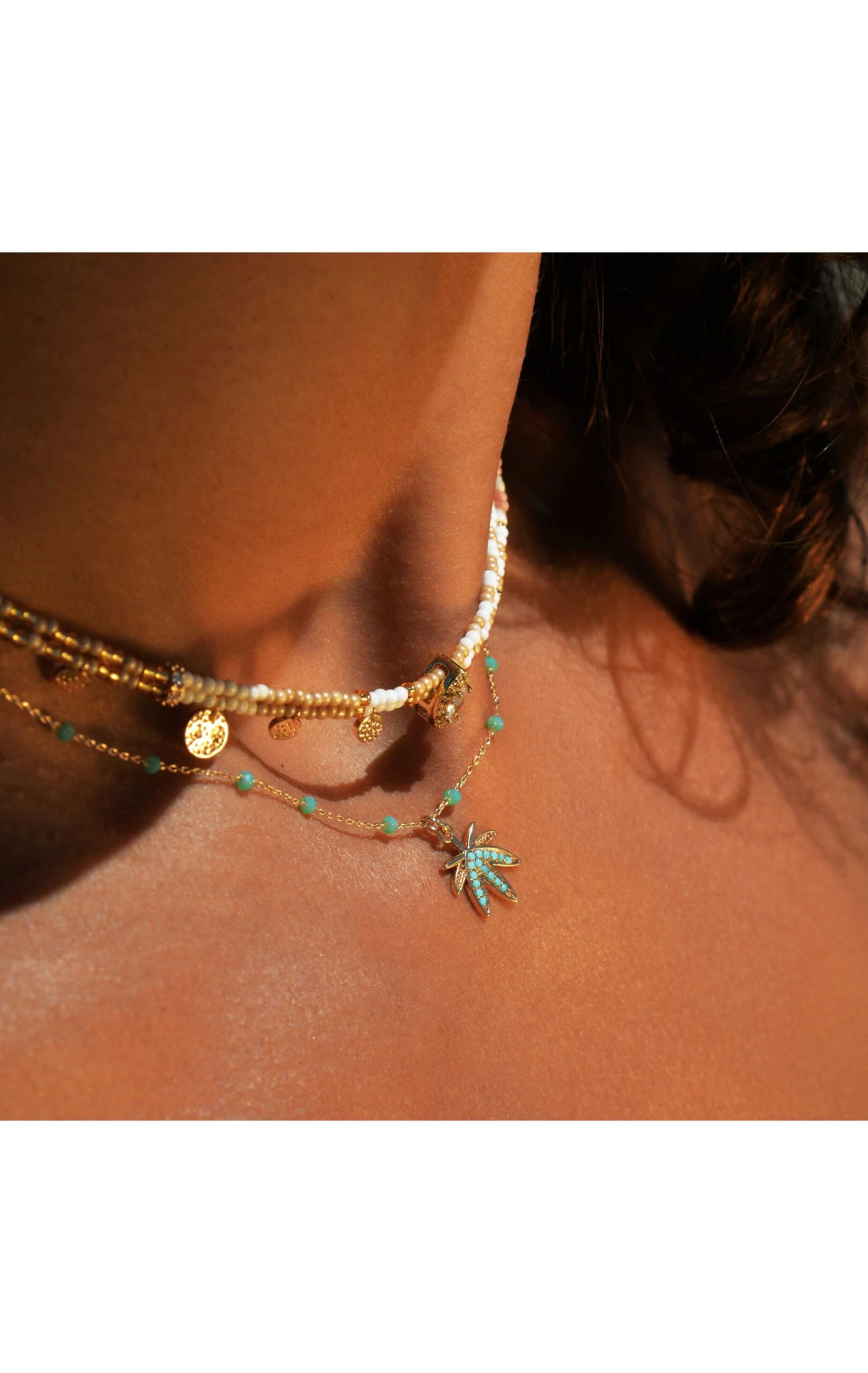 Collier ras de cou monté sur une ravissante chaîne chapelet très fine dorée à l’or fin, avec de petites perles turquoises. Au centre, une petite palmette, feuille de cannabis, pavée de strass turquoises. Avec ce bijou fait à la main, Hipanema revisite le look baba cool, hippie chic.