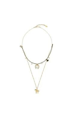 Adoptez un look gypsy plein d’Ă©lĂ©gance cet hiver! Vous allez adorer ce collier double rang dorĂ© Ă l’or fin 14 carats. Le premier lien est une tresse dĂ©licate dans les tons noir, caramel, beige et dorĂ©, ornĂ©e de petites pampilles dorĂ©es et d’un fer Ă cheval pavĂ© de strass effet diamant en son centre, qui vous portera bonheur. Le deuxième lien est une chaĂ®ne qui est ornĂ©e en son centre d’un petit cheval articulĂ© Ă l’oeil dĂ©clicatement ornĂ© d’une petite pyrite. Un collier ethnique chic ayant la singularitĂ© de mĂŞler les genres et les matières.