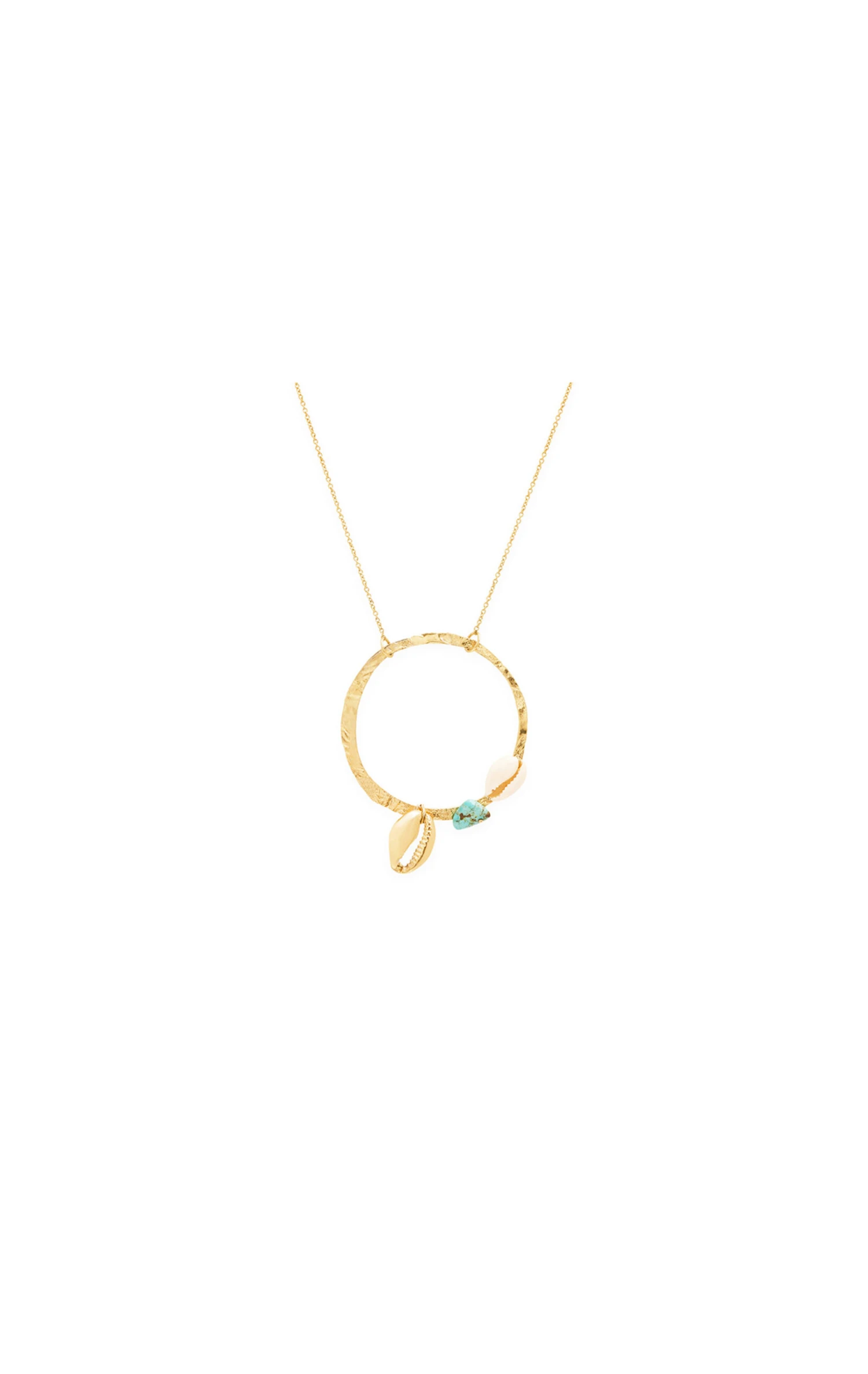 Collier doré à l’or fin 14 carats avec une pièce centrale évidée réhaussée de breloques en mix de coquillages et touche de turquoise.