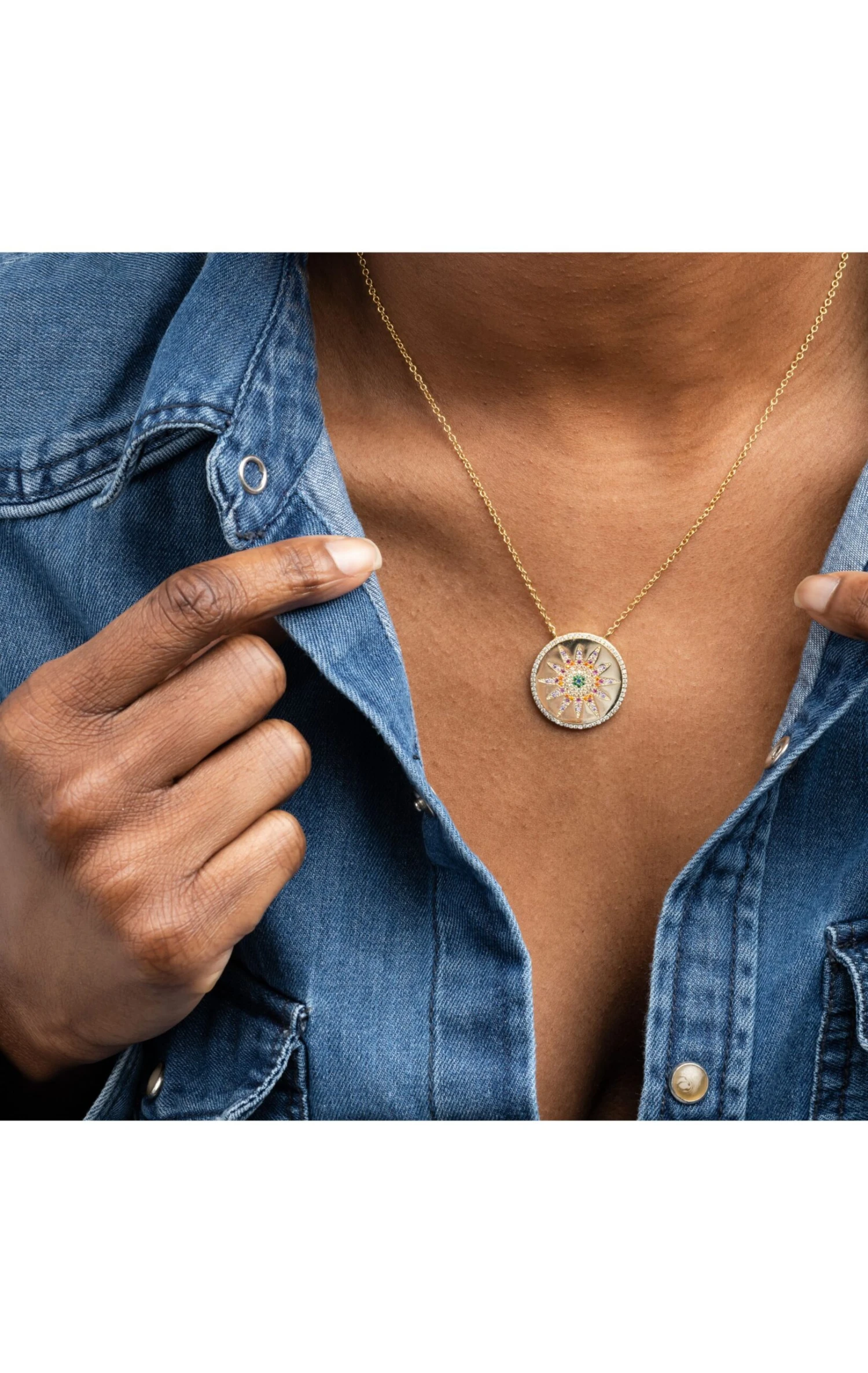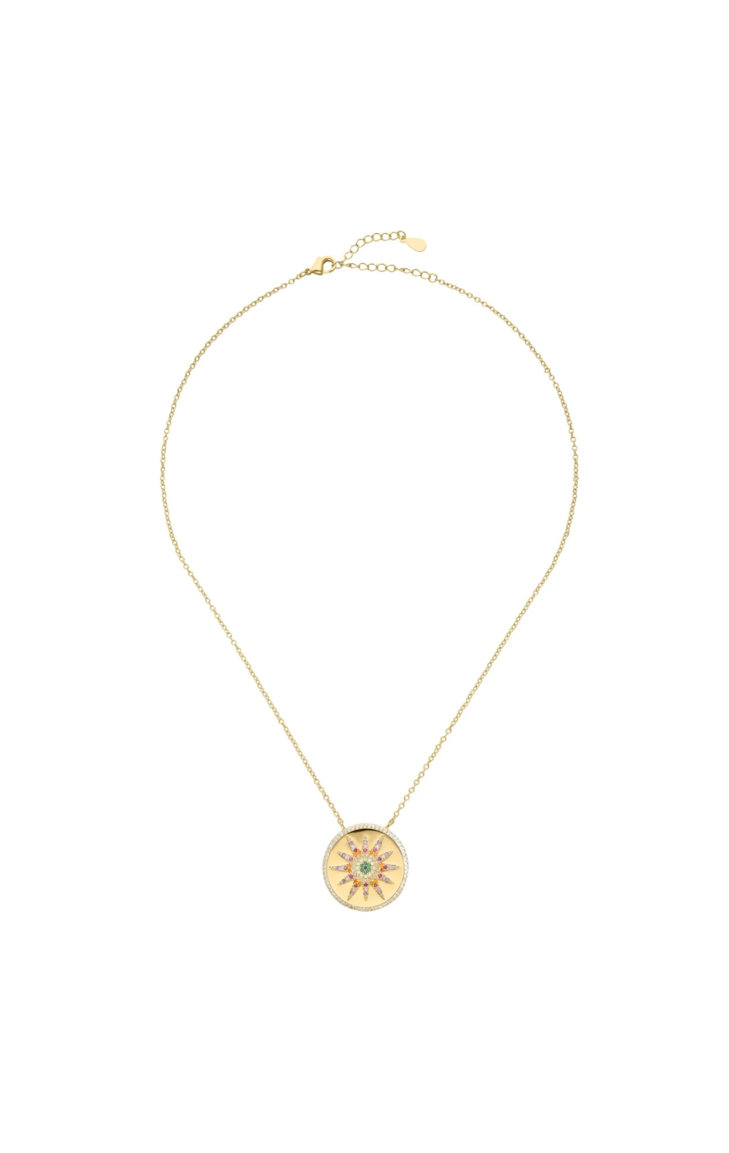 Collier ras de cou doré à l’or fin, composé d’un médaillon effet soleil multicouleurs avec pierres violet effet améthyste, rouge effet rubis, vert effet émeraude. Pavage de strass tout autour, moulé sur une chaîne forçat. Le collier parfait pour l’été, avec son médaillon effet pentacle, très solaire, pour un rendu joaillerie bohème d’inspiration Ibiza.