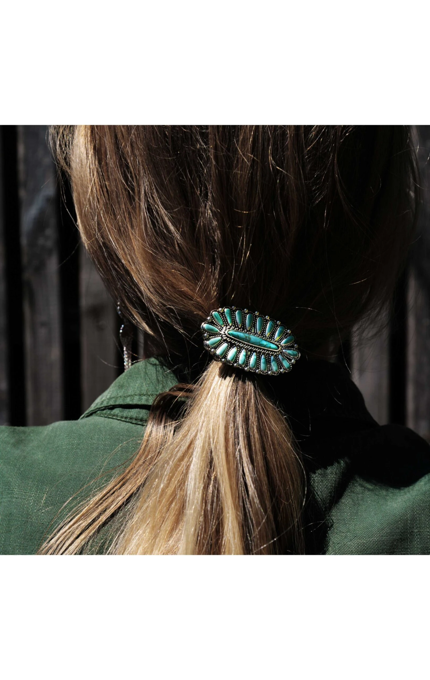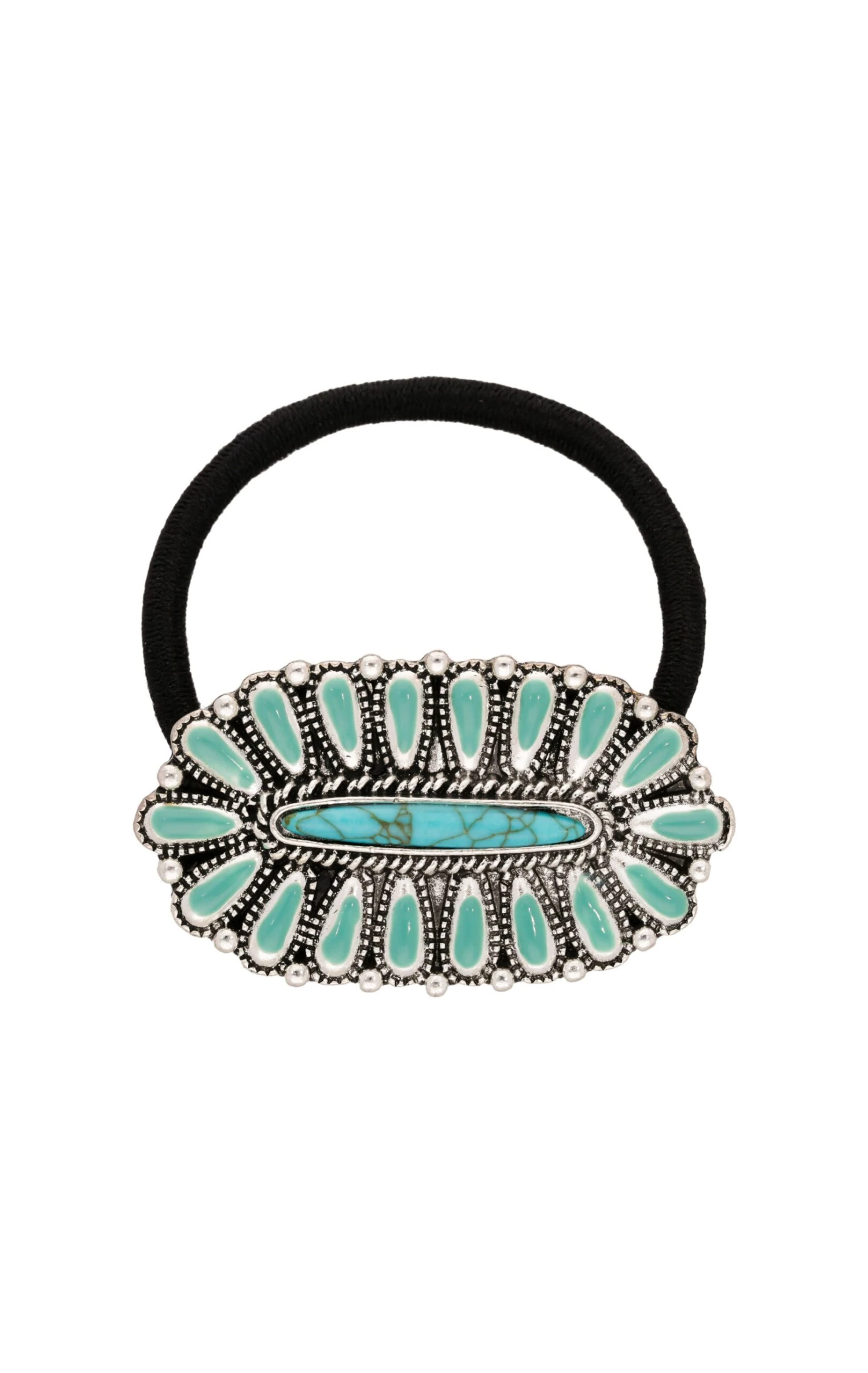 Élastique noir pour cheveux avec un cabochon argenté au centre, inspiré des tribus Zunis. On aime l’association des gouttes effet turquoise, et de l’ornement émail qui rend hommage à la délicatesse de l’artisanat Amérindien.
