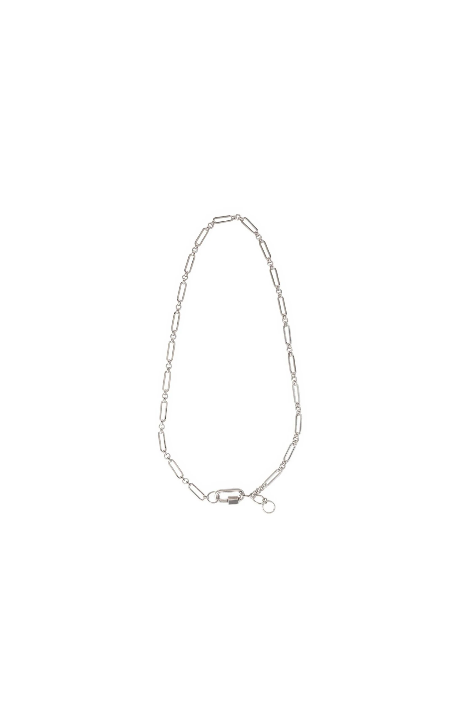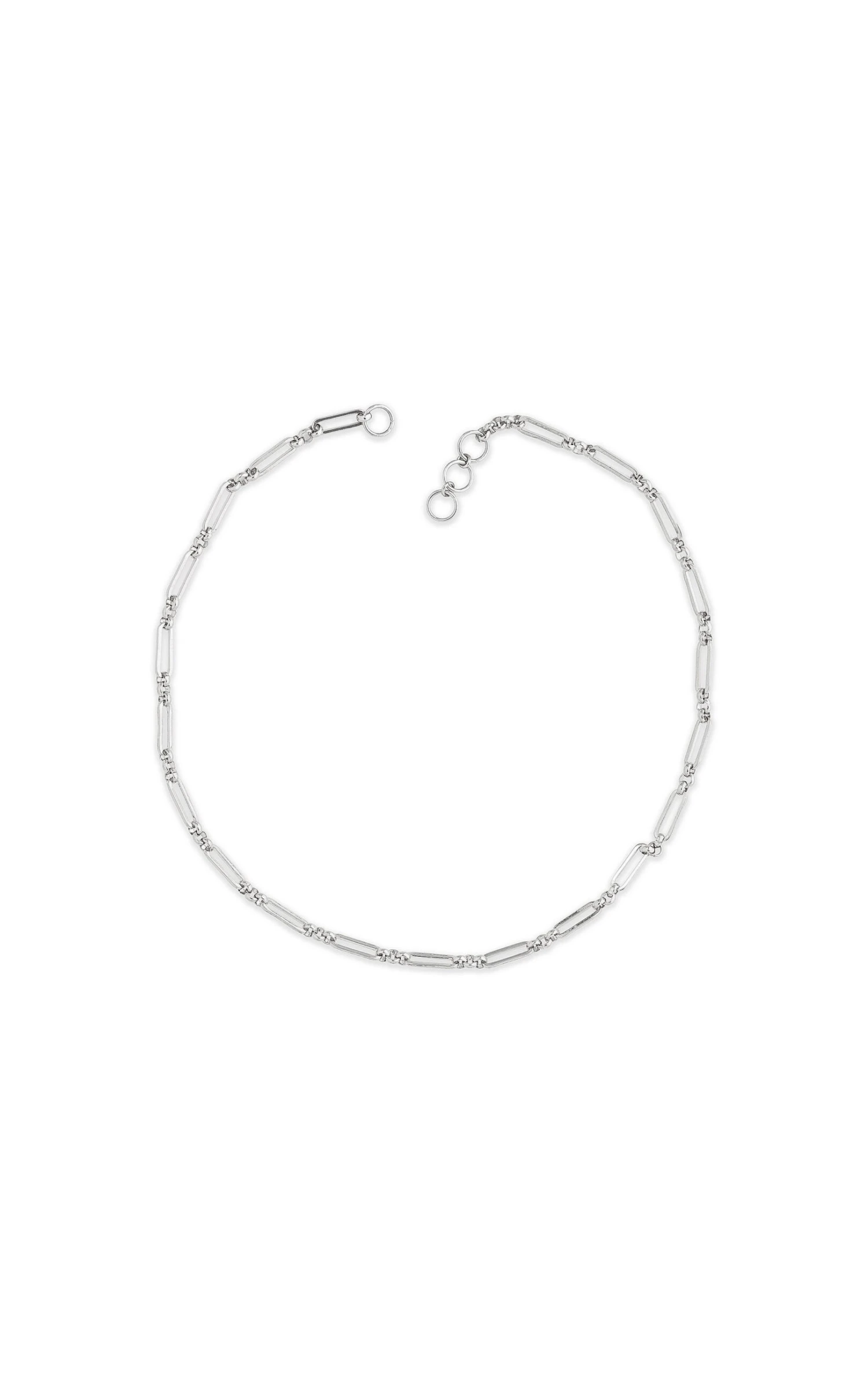 Les colliers “CRUSOE” sont les liens en chaîne ras du cou. Ici vous est présenté une chaîne fine de maille rectangle intercalée de trois petits anneaux, argentée au rhodium. Fermoir non inclus, il faudra compléter votre commande avec un Locket.