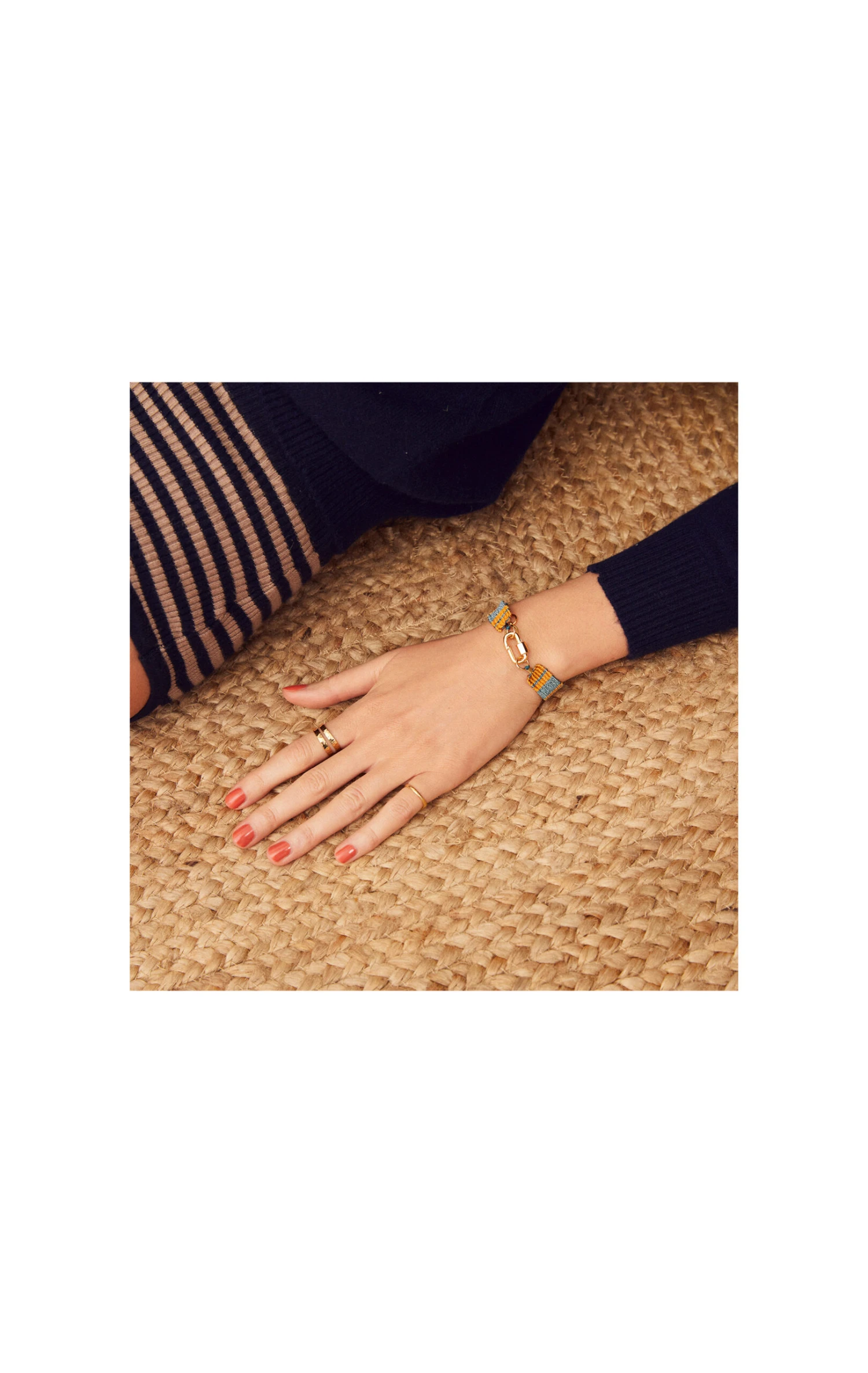 Lien entièrement tissé à la main de fil très fin de couleur turquoise fonçé, bleu canard et bronze. Décoré de trois pampilles dorées en son centre, pavées de strass effet diamant. À associer avec les fermoirs “LOCKETS”.