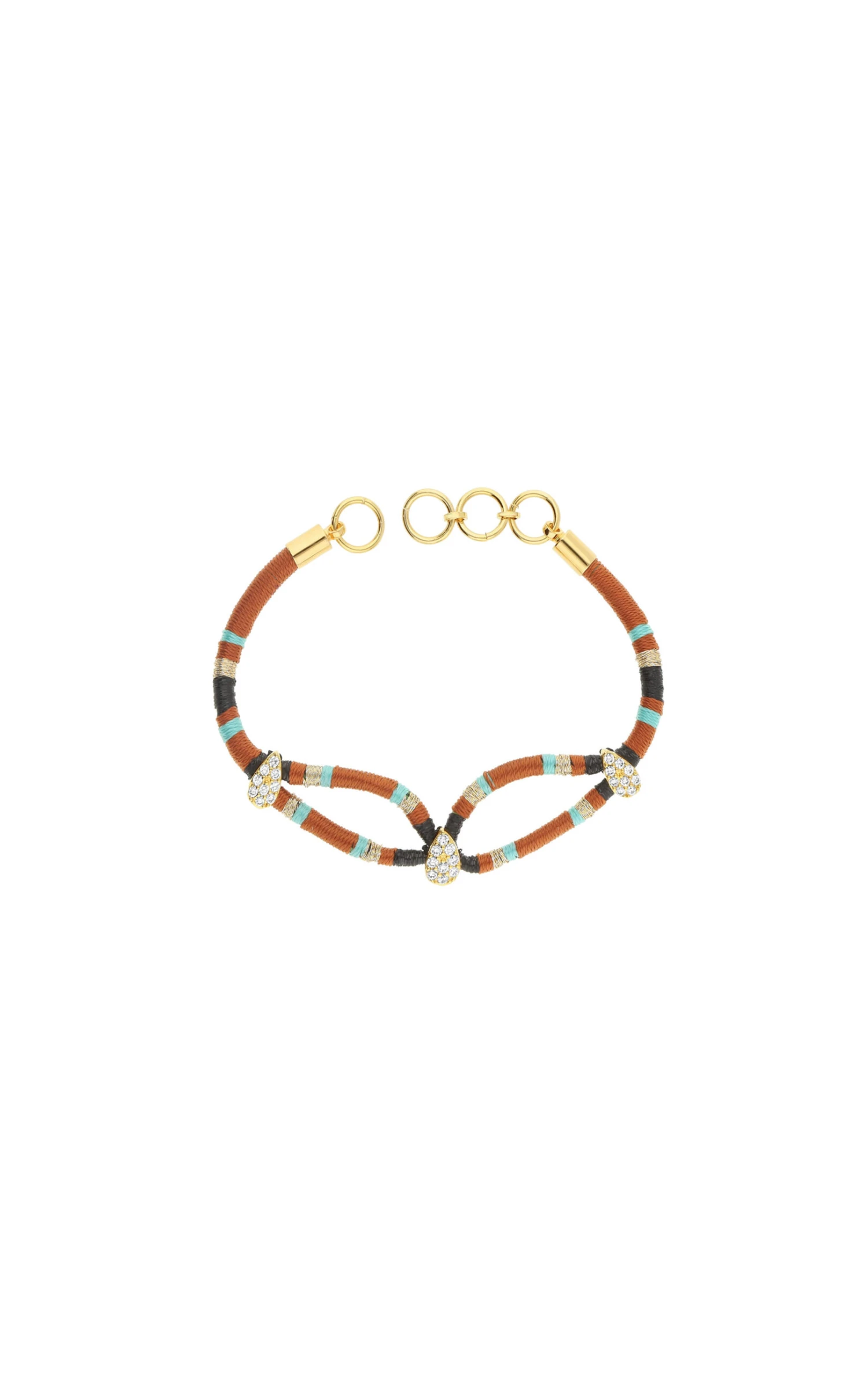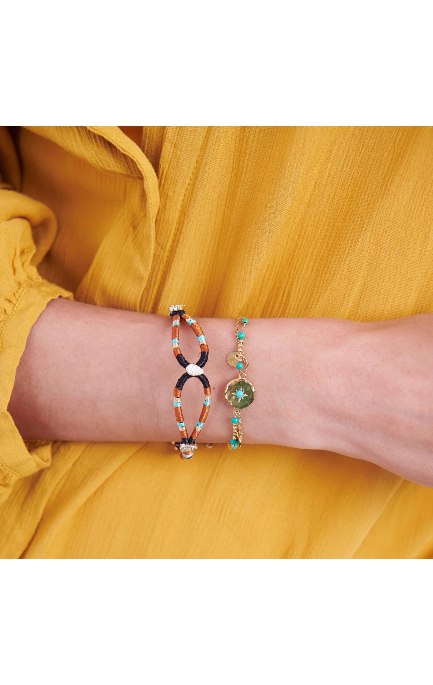 Lien doré tressé de fil coloré dans les tons marron capuccino, rouille, bleu turquoise, doré et noir. Orné de trois pampilles goutte dorées pavées de strass effet diamant. À associer avec les fermoirs “LOCKETS”.