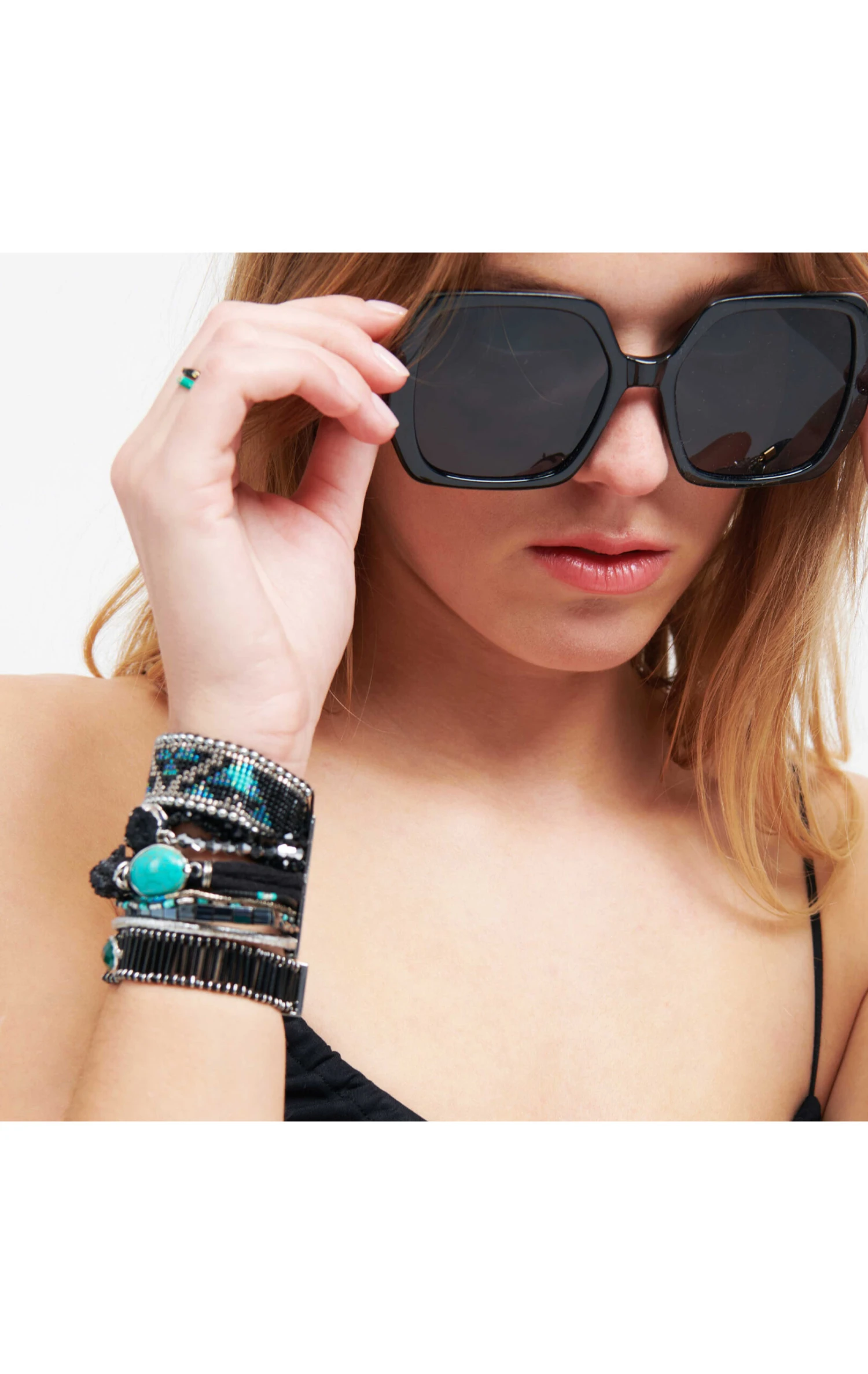 Manchette composée d’une multitude de liens brésiliens composé d’un bracelet tressé en perles turquoise