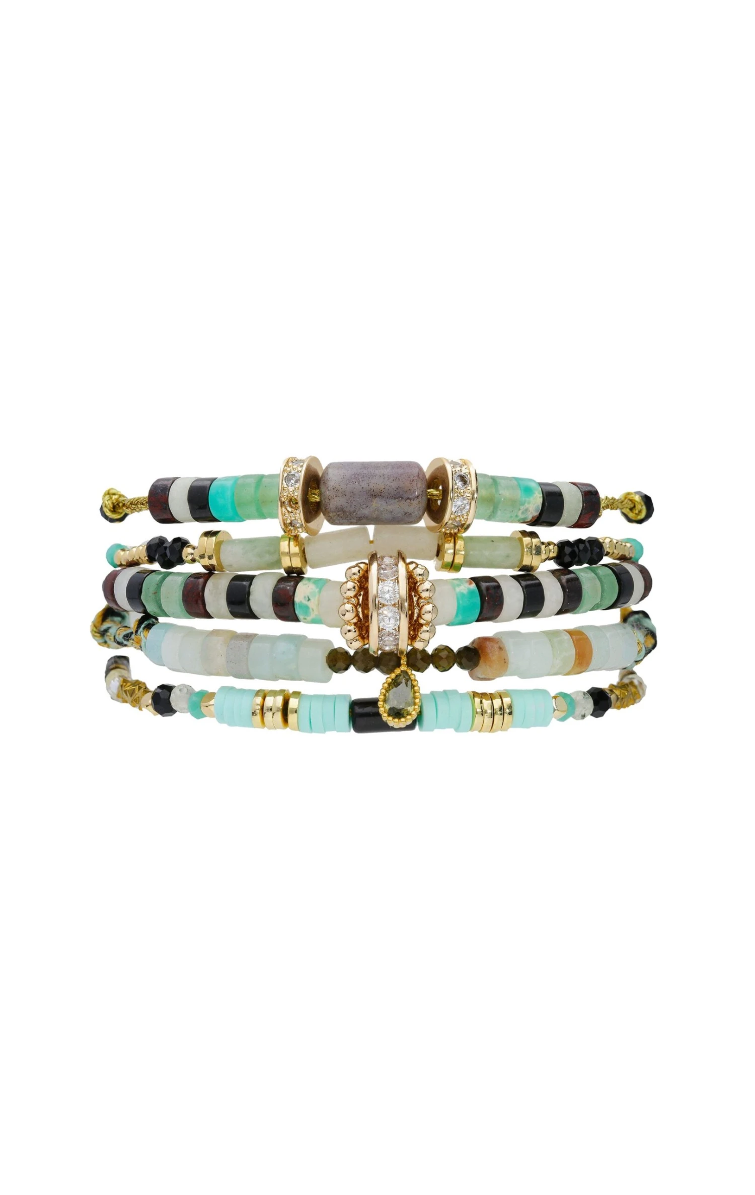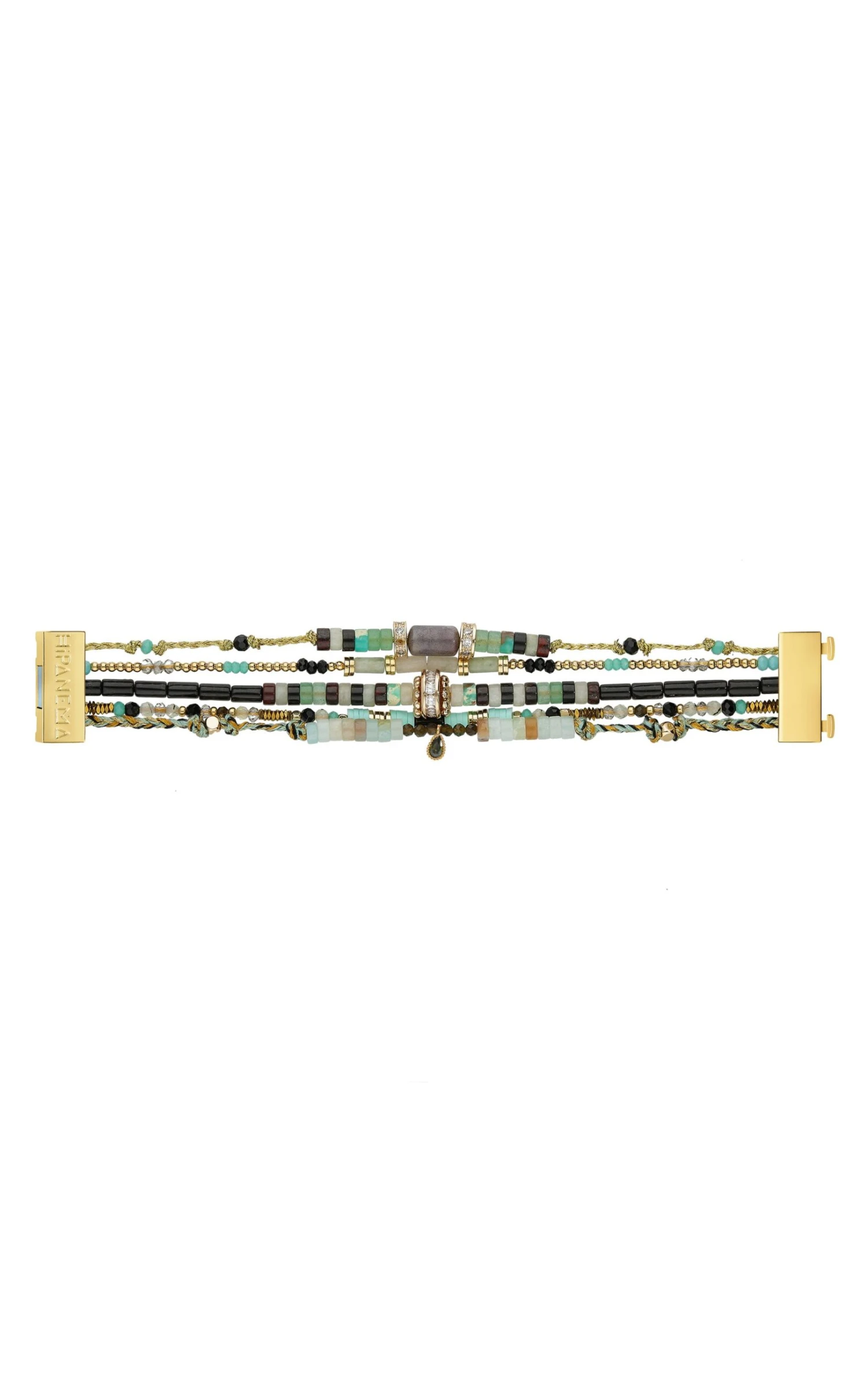 Manchette composée de cinq liens faits à la main de tressages noir, doré, vert d’eau, Jade et turquoise. On y retrouve également des pampilles dorées à l’or fin 14 carats et des pierres semi-précieuses. Un essentiel très précieux pour une saison estivale haute en couleur !