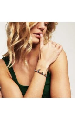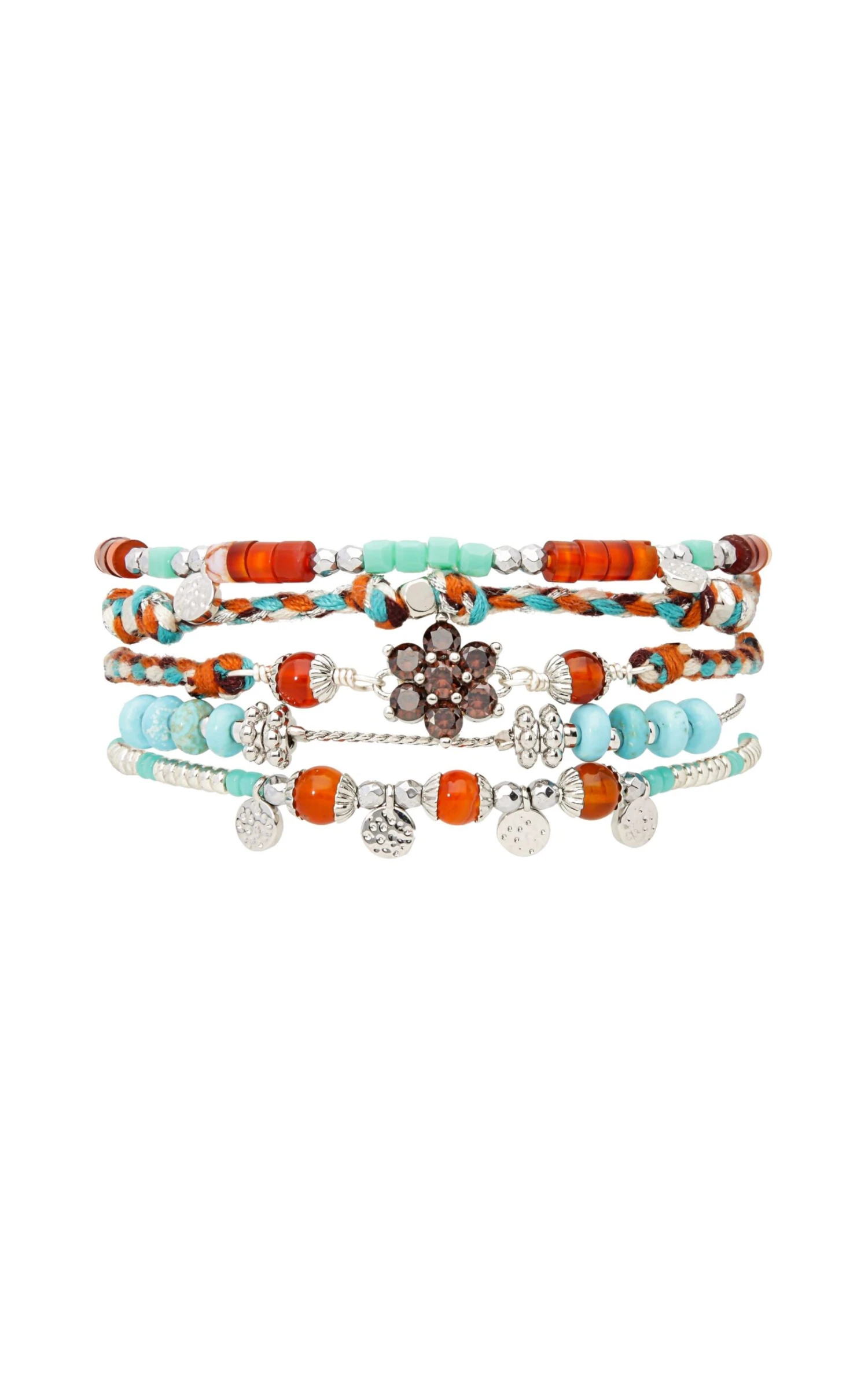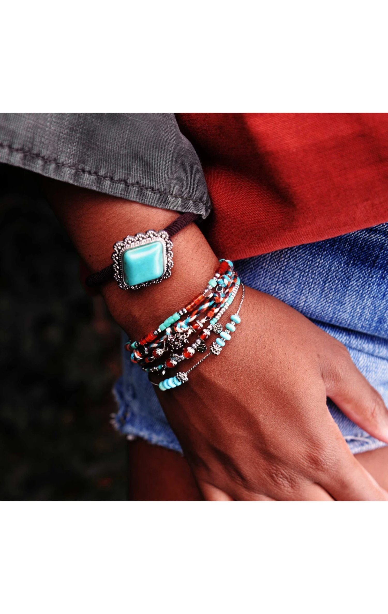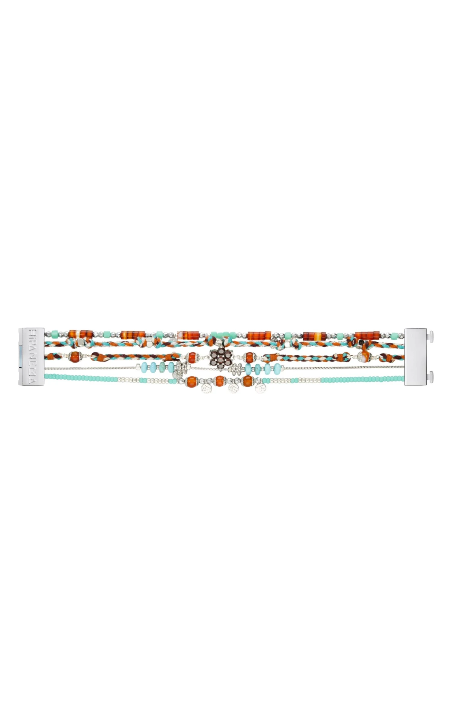 Bracelet manchette aux allures Navajo composĂ© de cinq liens dans les tons grenat, turquoise, et caramel. On y retrouve tout le panache de ces couleurs terre des tribus AmĂ©rindiennes avec ces chaĂ®nes argentĂ©es, ses tresses colorĂ©es, et ses pampilles pleines d’Ă©clat.