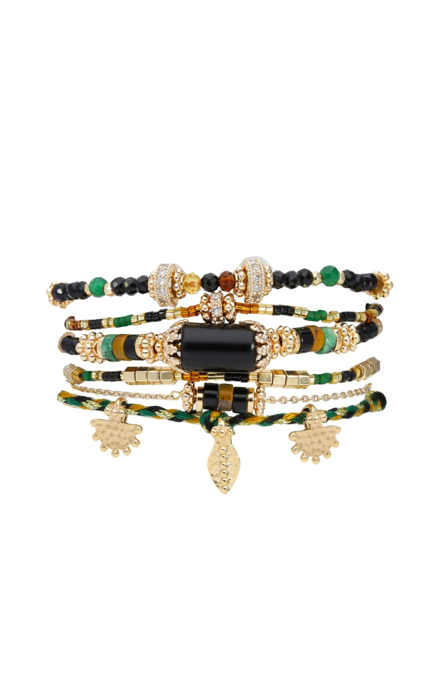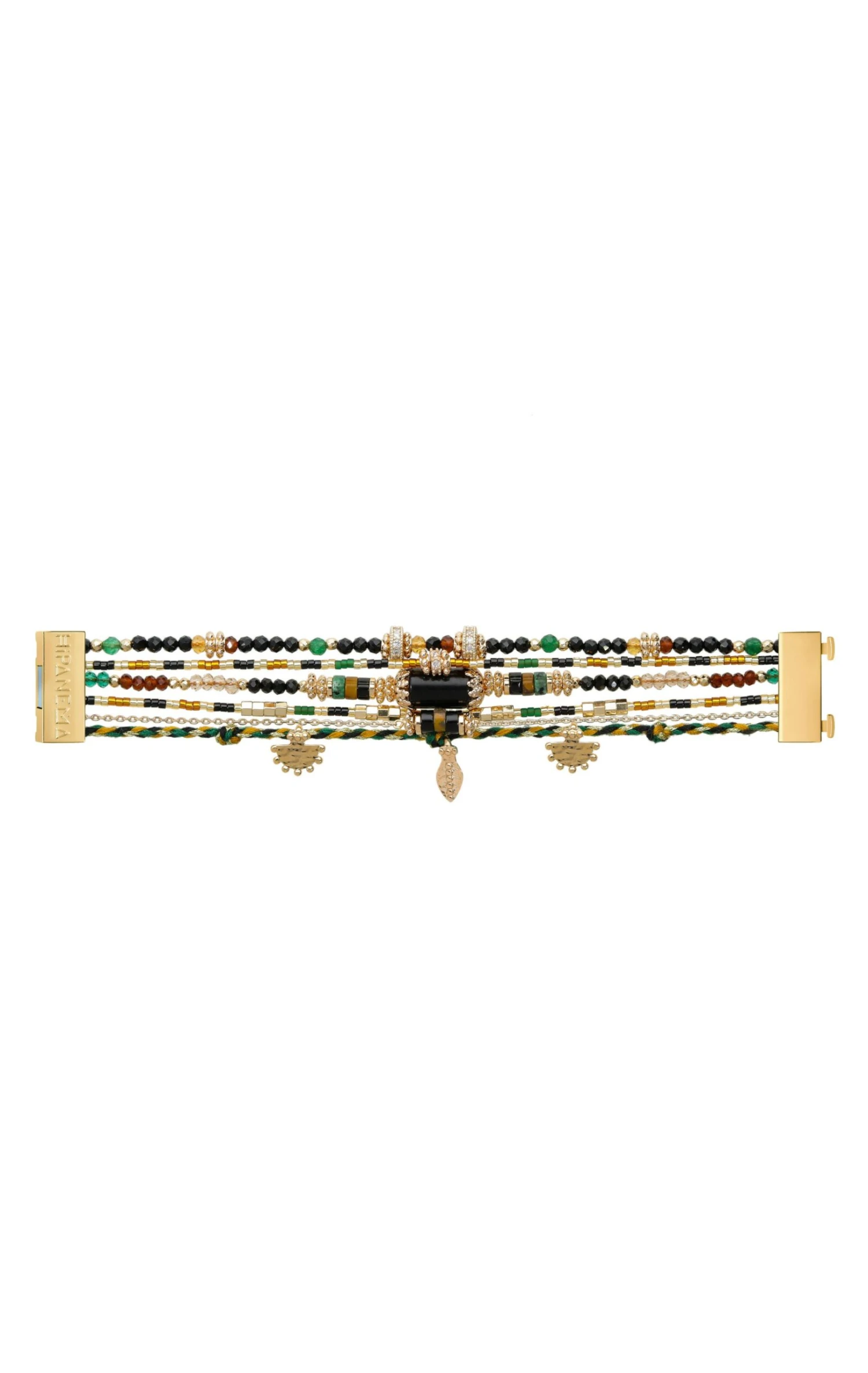 Année après année, nous vous proposons des manchettes toujours plus exceptionnelles! Cette version dans les tons noir onyx, vert émeraude et ambre est composée de six liens en pierres semi-précieuses et perles de verre réhaussées de multiples pampilles dorées à l’or fin 14 carats. Son style travaillé, tel un bijou ancien en fait une pièce d’exception à l’esprit ethnique chic. Vous allez adorer les petites palmes qui décorent cette manchette et la rendent incontournable pour cette saison!