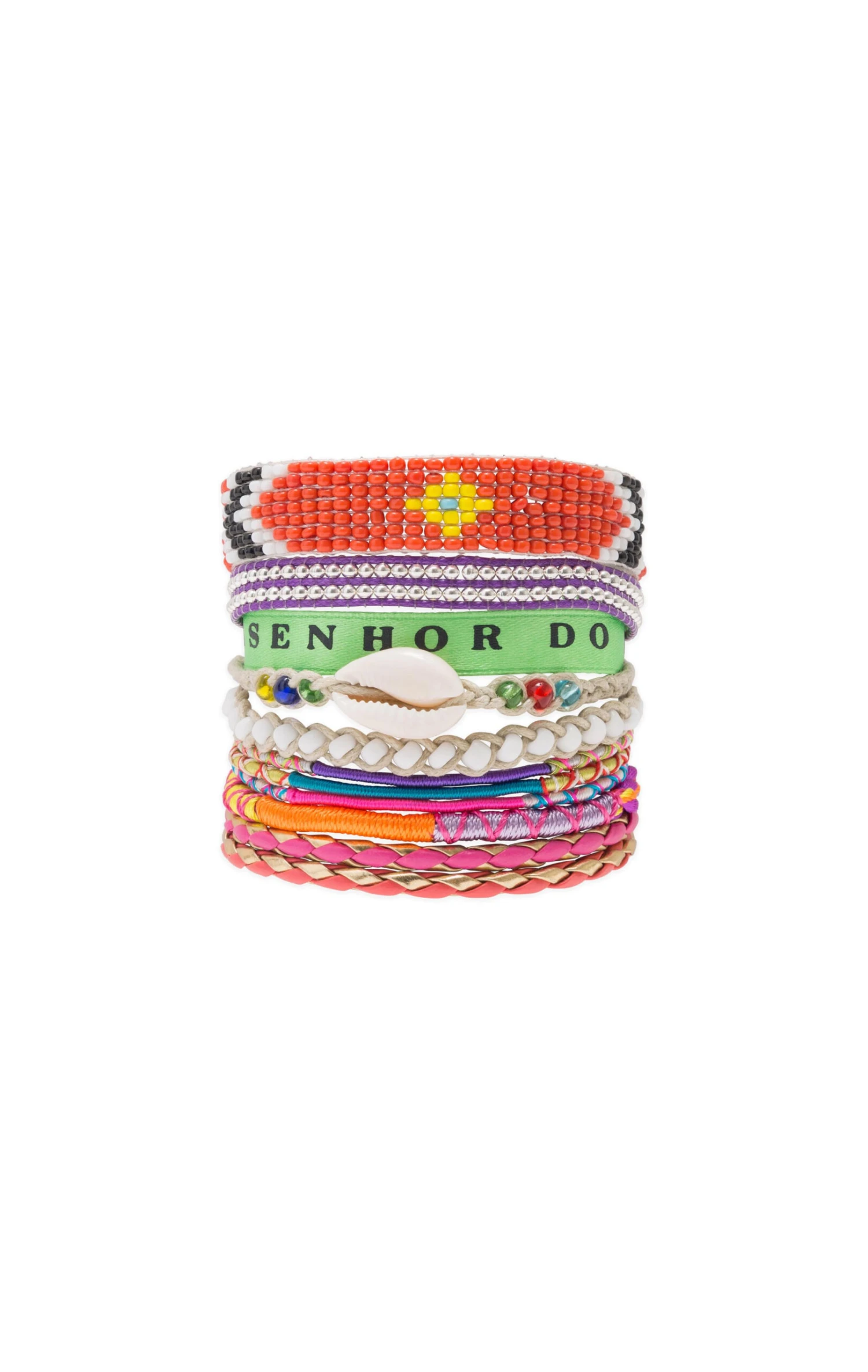 Ici est présenté la manchette “Version 02”, composée de liens de coton multicolores, d’un bracelet brésilien en perles orange, blanc et noir, d’un coquillage cowrie et du légendaire ruban sehnor da bonfim porte-bonheur.